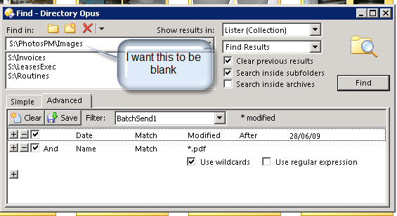 Find IN "S:\Routines" "S:\LeasesExec" "S:\Invoices" NAME="BatchSend1" FILTER CLEAR=yes SHOWRESULTS=tab COLLNAME="SendThese"