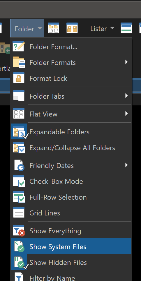 How to show hidden folders using DOpus 13, such as /appdata/ (in Windows)? Previous help topics on this did not align with what I'm seeing in 13. Could not find the answer in the DOpus manual either.