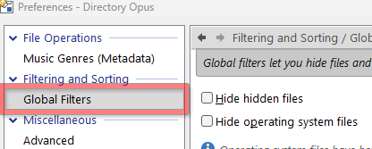 Preferences / Filtering and Sorting / Global Filters / Hide hidden files