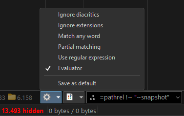 That makes sense. What I meant was more that maybe DOpus should set regex=off, partial=off etc. the moment the evaluator is enabled. At least I don’t know what regex=on would do when evaluator=on.