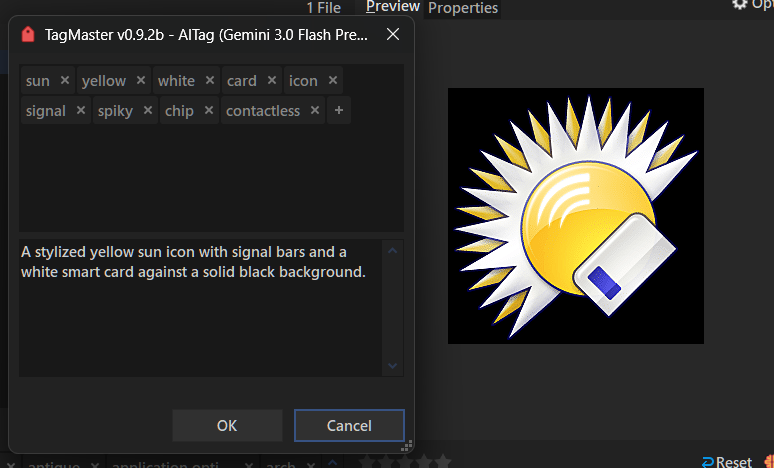 By default the dialog links to the current selection: pick files in Opus and the panel shows their tags, description input, preview, and rating values. There's also the FULL mode dialog, who has more additions and where you can work with any passed file and drop files in to add them to the batch.