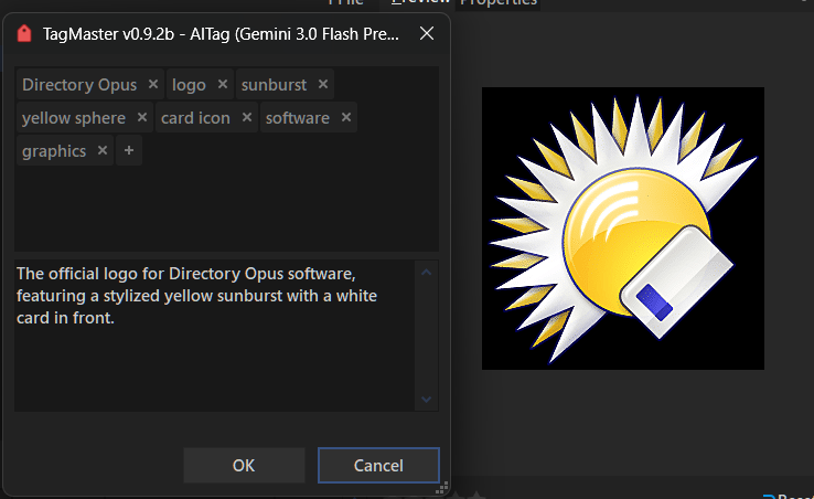TagMaster brings tagging in Directory Opus to another level. It gives you an easy to use interface where you can manage them through a database, add them or remove them from files with a single click, plus edit descriptions and ratings. You can run it linked to your current file display selection or in a fuller standalone mode for batch work.