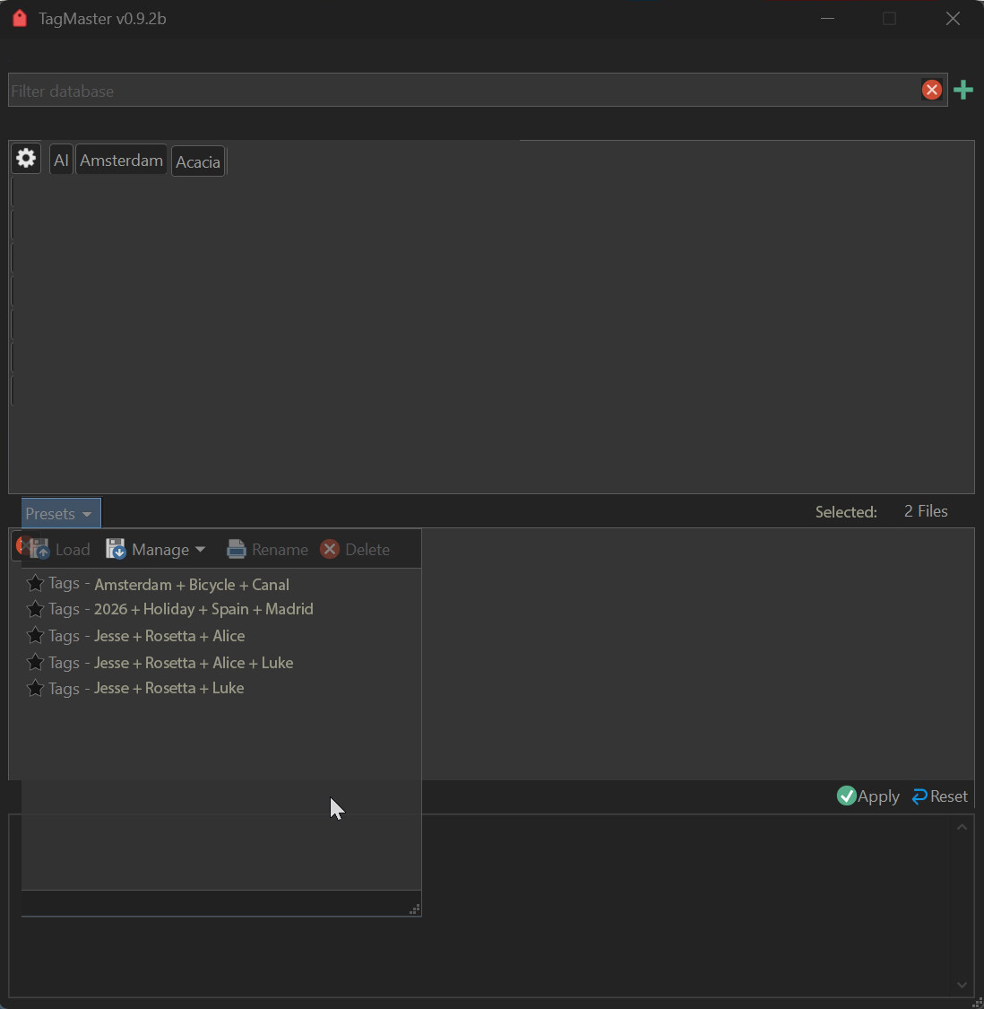 There are 2 panels in the window: one that shows the tag database (which has a filter at the top) and another panel that lists the common tags for the selected files.