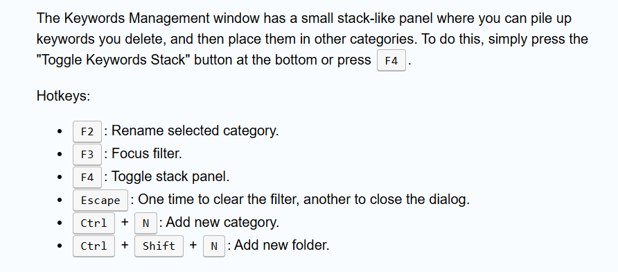 The Keywords Management window has a small stack-like panel where you can pile up keywords you delete, and then place them in other categories. To do this, simply press the "Toggle Keywords Stack" button at the bottom or press F4.