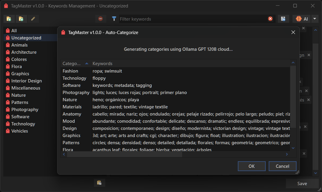 If you want, from this dialog, by pressing the AI button, you can auto-categorize keywords that are not in any group. You can also choose the model to use for the task.