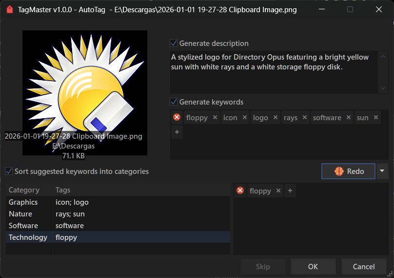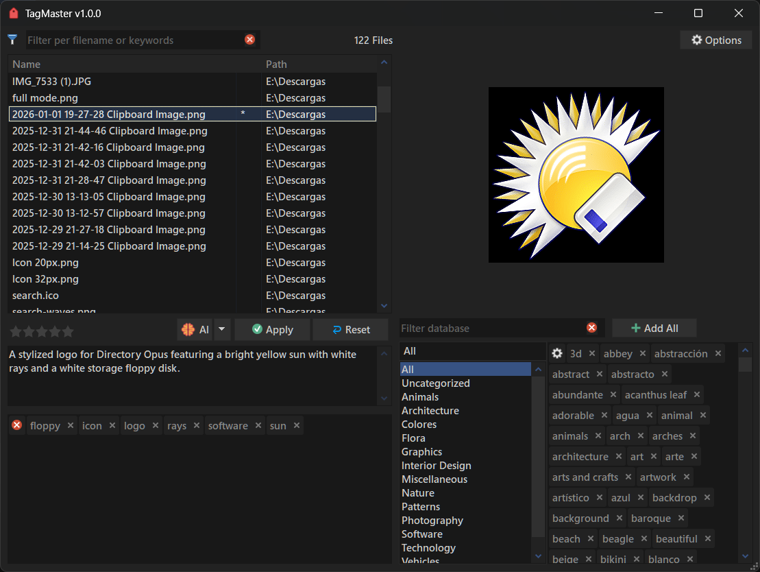 TagMaster can import the internal Directory Opus keyword database to reuse existing tags. To do this, press the "Import from Opus keywords database" button.