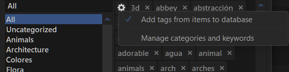 This dialog can also be accesed from the main window, by pressing the cog icon and select "Manage keywords and categories".